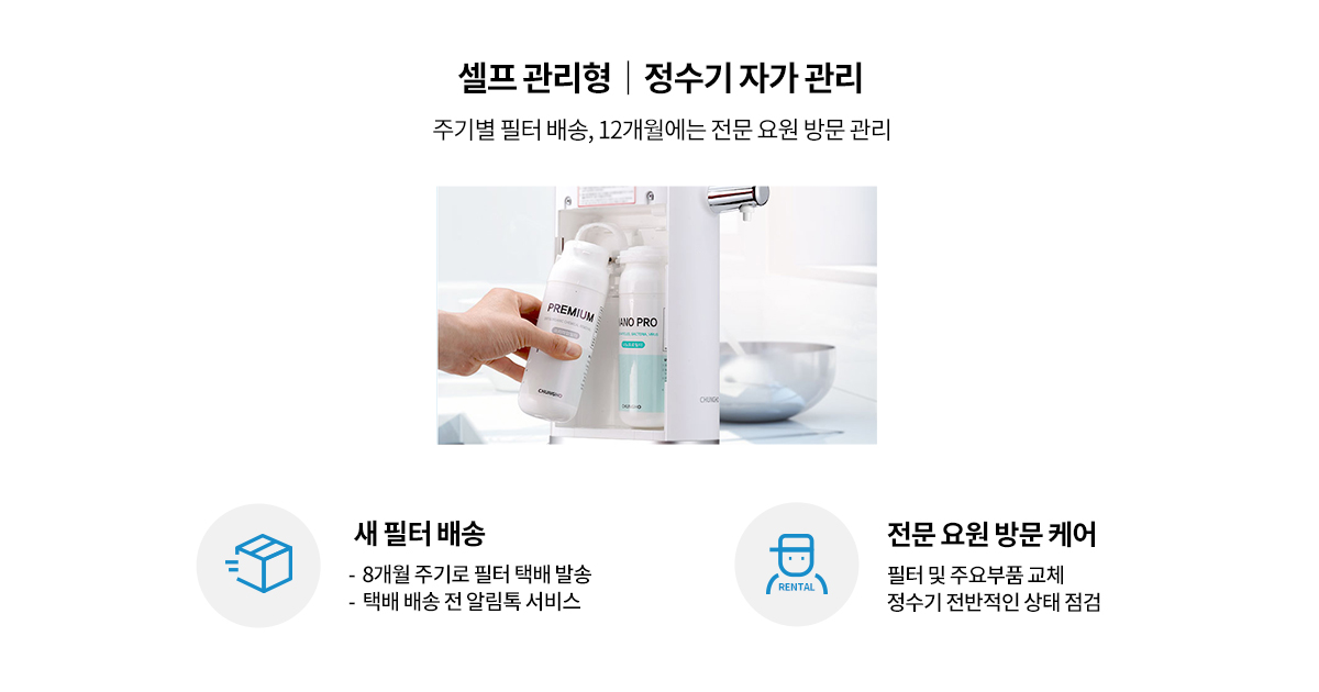 | 비고 | ■ 관리변경 - 14일이내 : 셀프 ↔ 방문 변경가능 - 14일이후 : 불가 ■ 토요일 설치 및 AS접수 마감 시간 (1) 설치 : 금요일 17시 30분까지 출고 의뢰 계정 (2) AS : 금요일 17시 30분까지 AS 접수 계정 ■ 정수기 외장형펌프 39,000원 (수압 불가로 펌프 요청시에 비용 납부 후 진행 가능) ■ 전모델 튜빙선 빼는 작업 불가 - 누수및 고장위험으로 전모델 불가 ■ 설치 불가한 지역 1. 전남 진도군 조도면 2. 전남 완도군 생일면 3. 전남 영광군 낙월면 4. 인천 옹진군 북도면 5. 인천 옹진군 자월면 ㅁ소유권이전되기 전(의무기간 전) 철거요청시: 2만원 > 4만원으로 인상 (25.5월 1일 접수건부터 변경) ㅁ소유권이전 후 철거비: 5만원 (동일) |